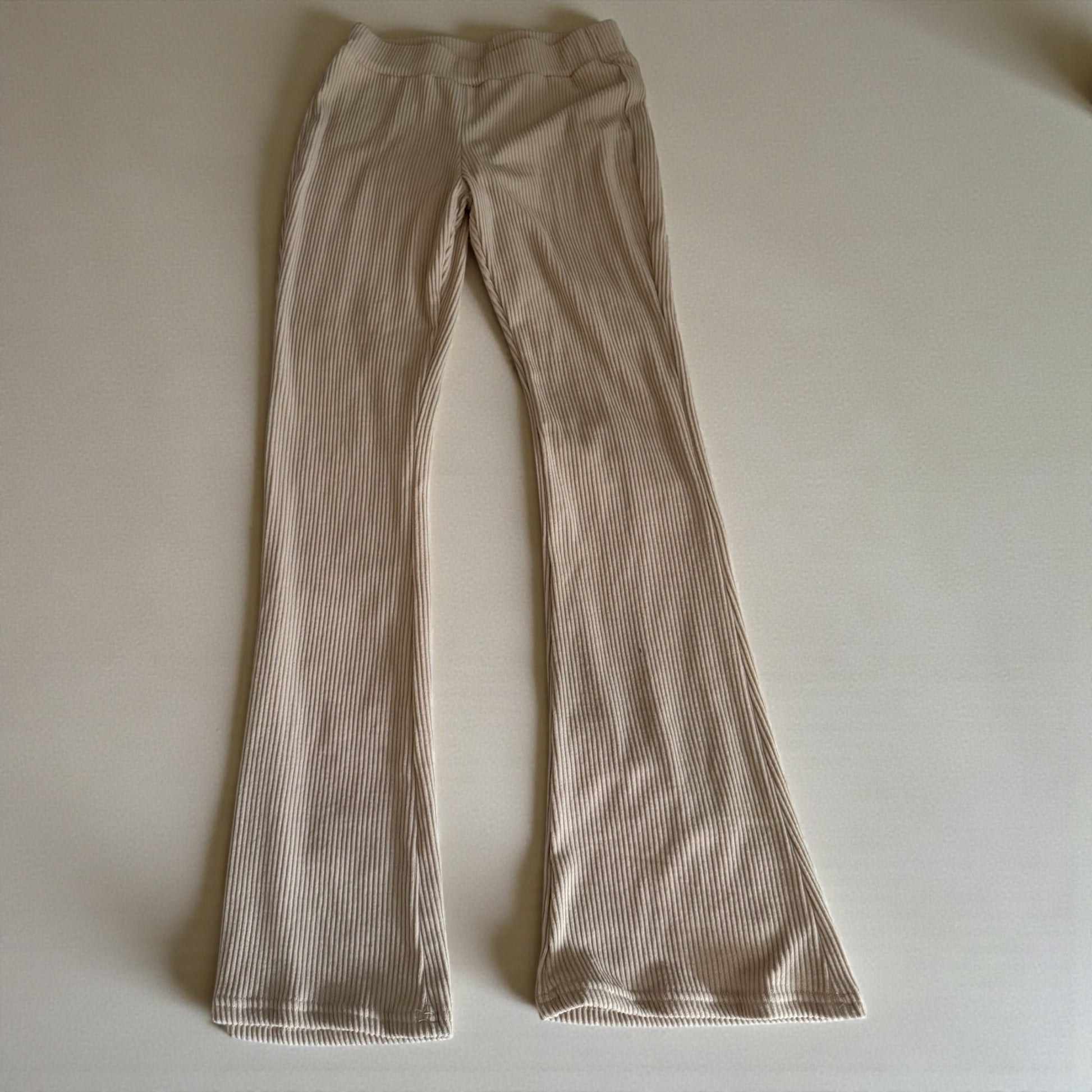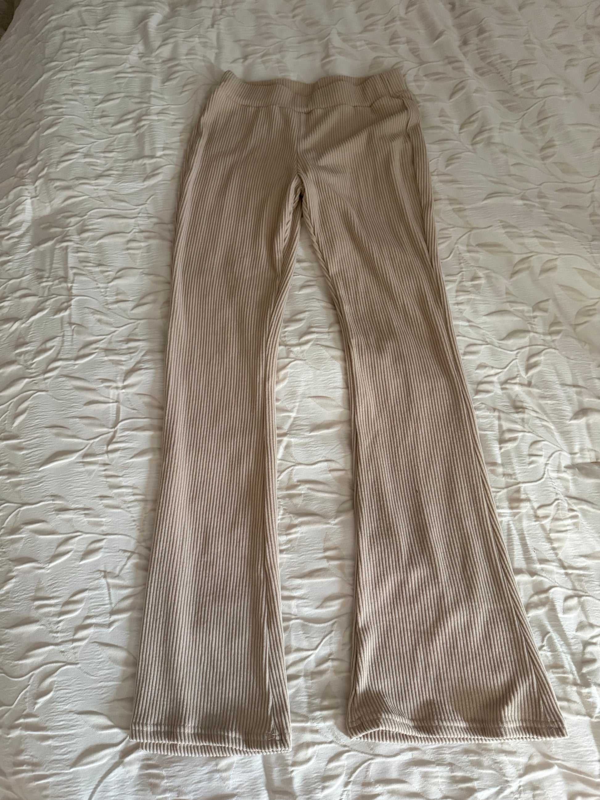 Size Medium but feel more like a Small. I bought this as a set and only wanted the zip up it came with. Never used these pants. New and unused. Extremely soft, beige, and stretchy.