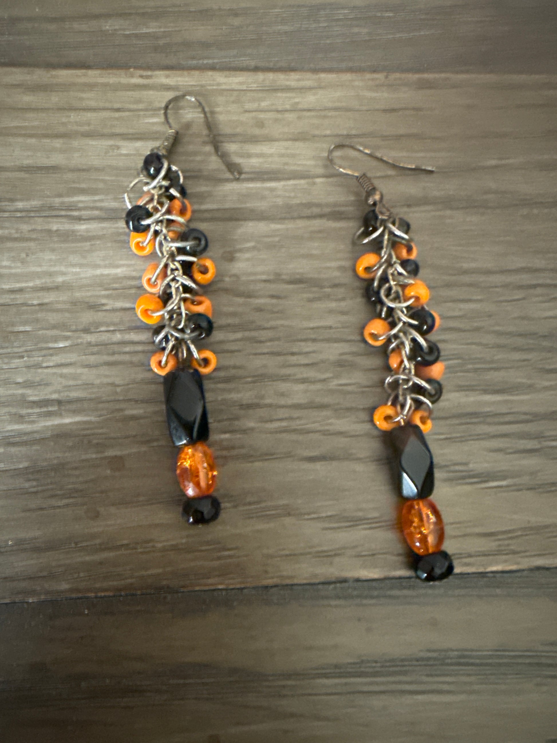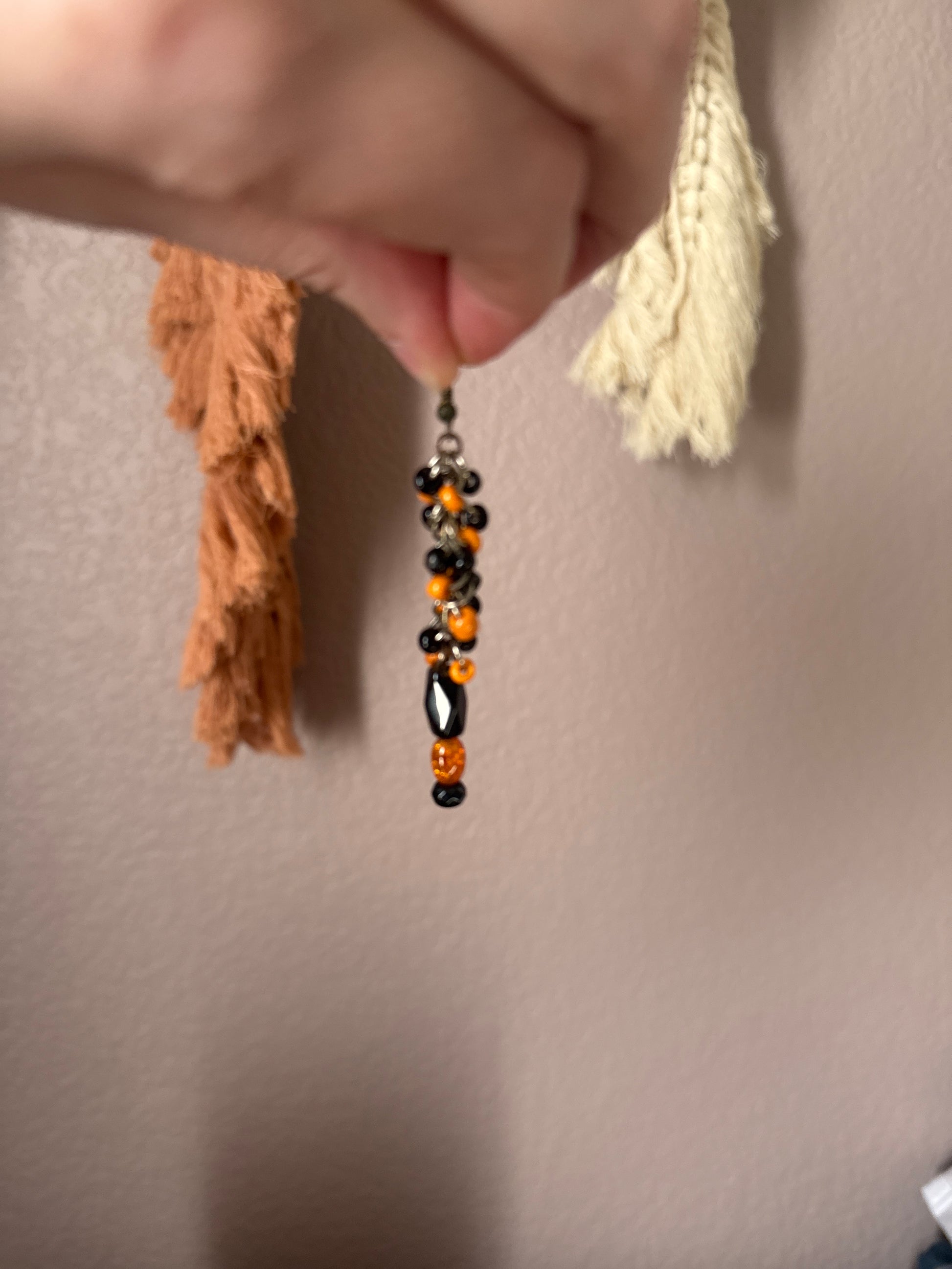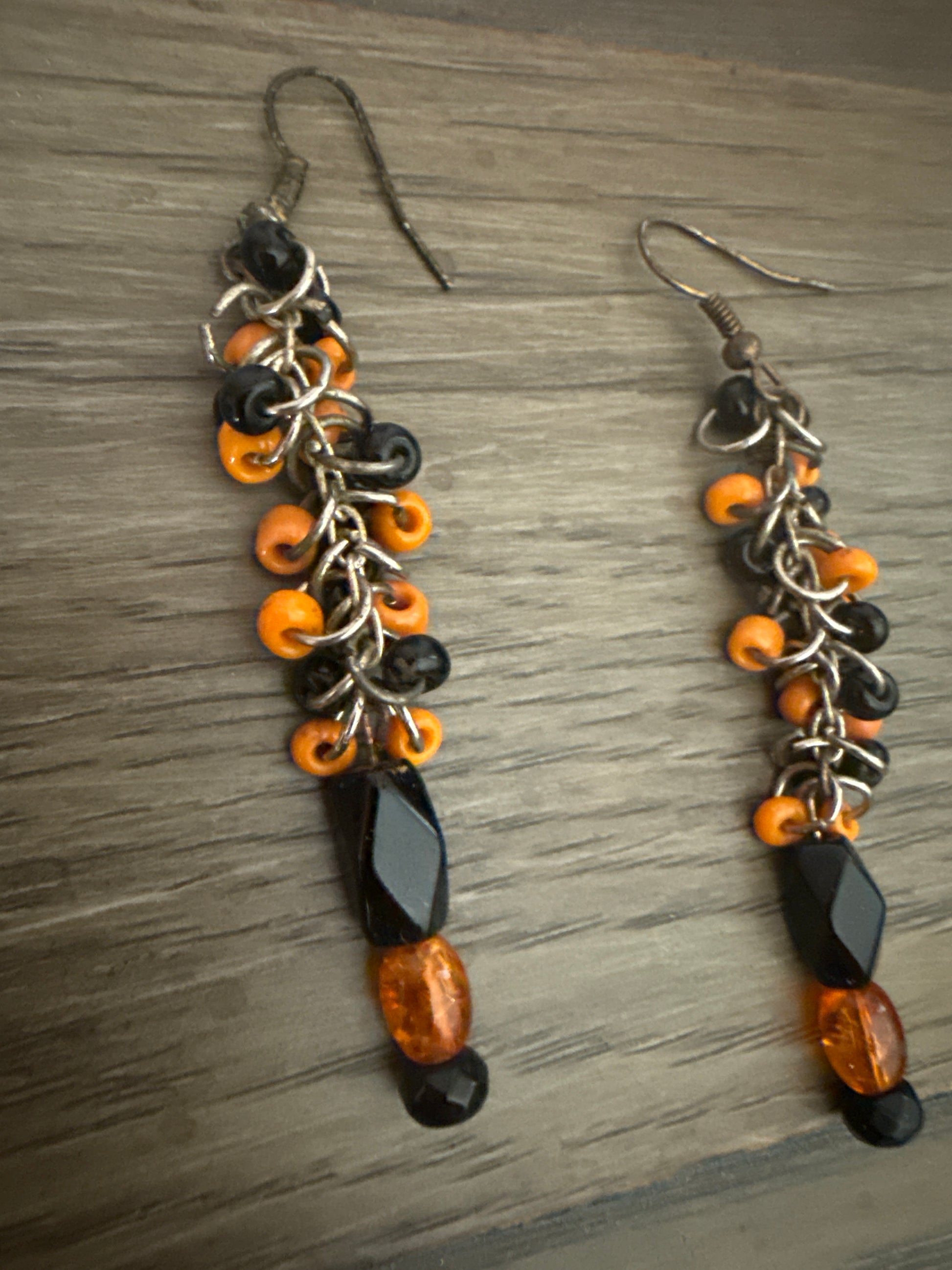 These were handmade by my sister, and I only wore them a few times during the Halloween season. Very festive and dear! About 2in long. Dangly beaded on a hook. NOT hypoallergenic. (Easy to change that) Final sale