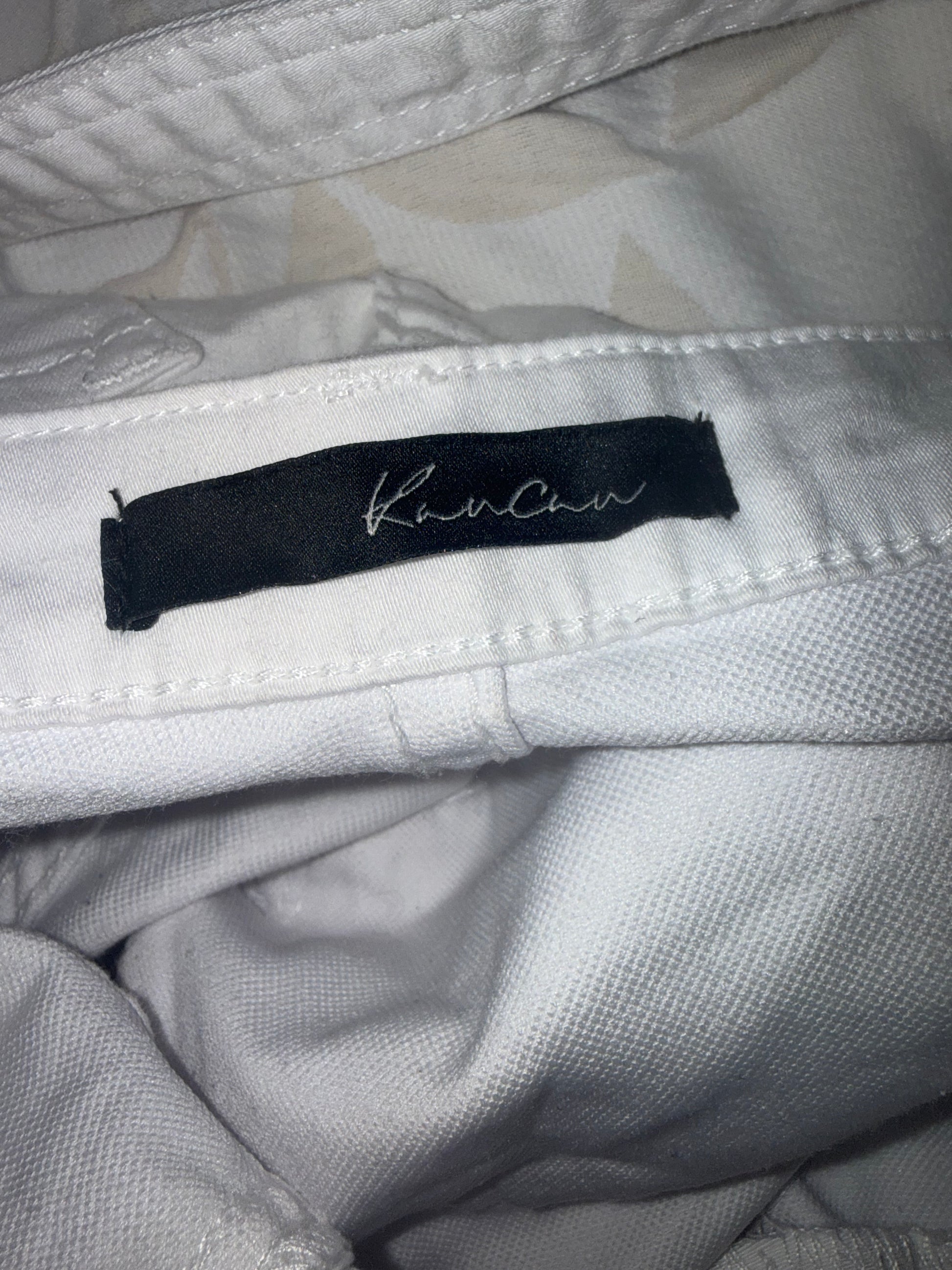 These are still crisp and white though slightly used. They are really Show off your curves as they are a skinny jean. It’s a lower back so it showcases a larger crisscross. There are button details on the side to get them off and on, but there is stretch and I was able to just pull them on. These are a size small, which should fit a 0 to 4. Will fit a five if you like it locked and loaded. 70% cotton, 28% polyester, 2% spandex. These were $80 new.