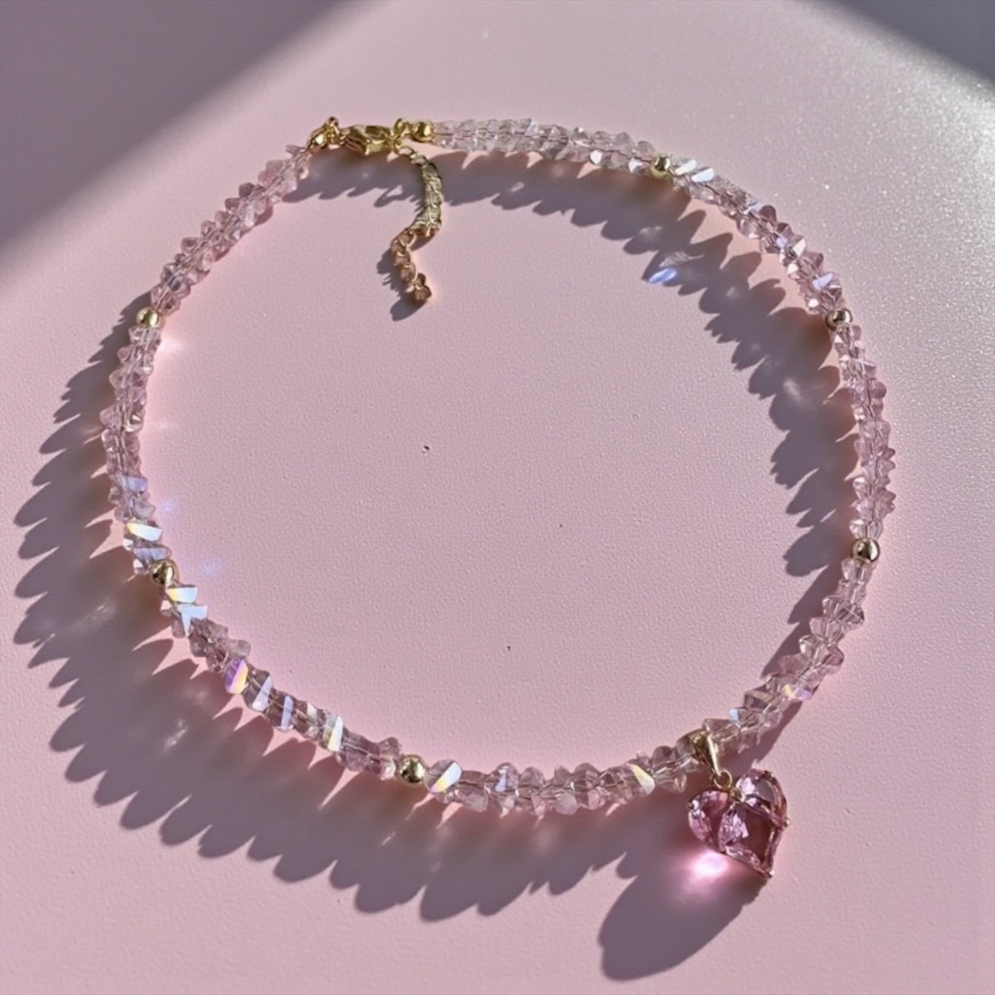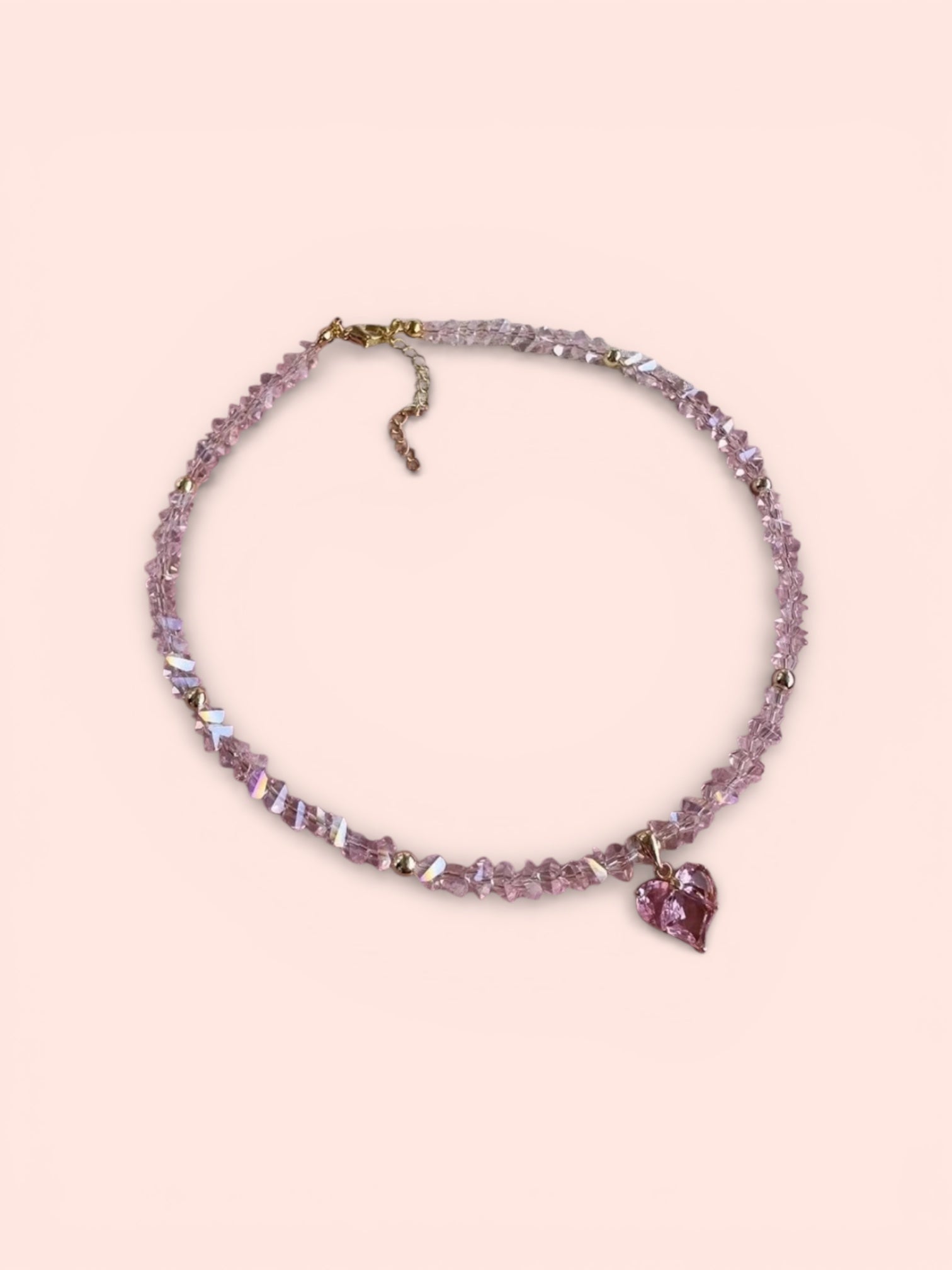 Delicate, feminine, and softly luminous, this pink glass heart necklace adds the perfect touch of sparkle to any look. Crafted with faceted glass beads that catch and reflect the light, it features a dainty pink glass heart charm for a romantic, dreamy finish. The soft blush tones and subtle iridescence make it ideal for everyday wear or layering with your favorite pieces.
